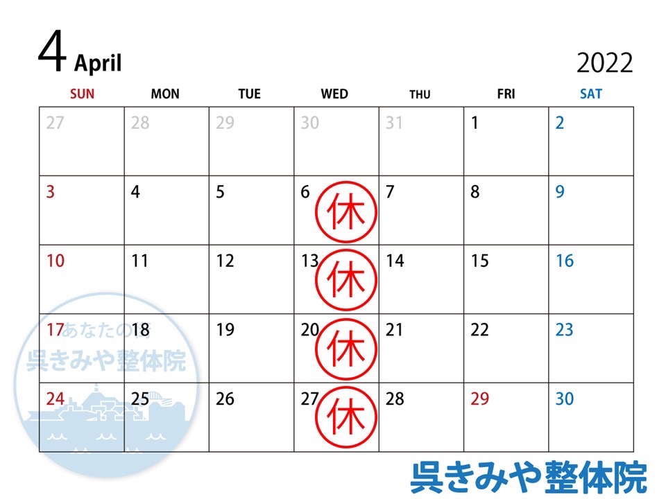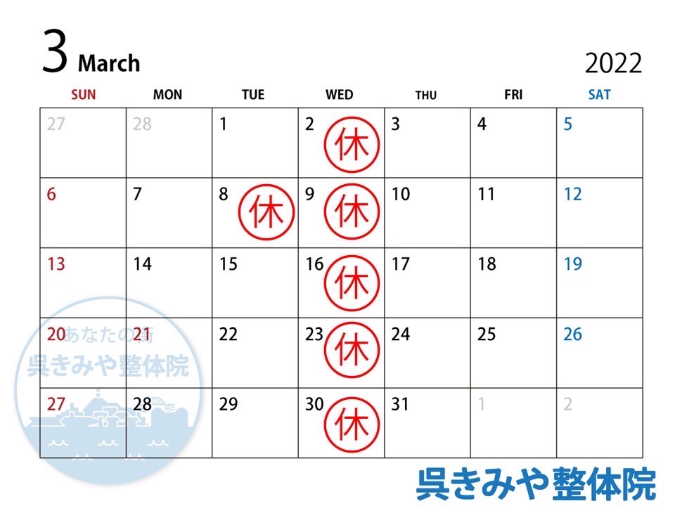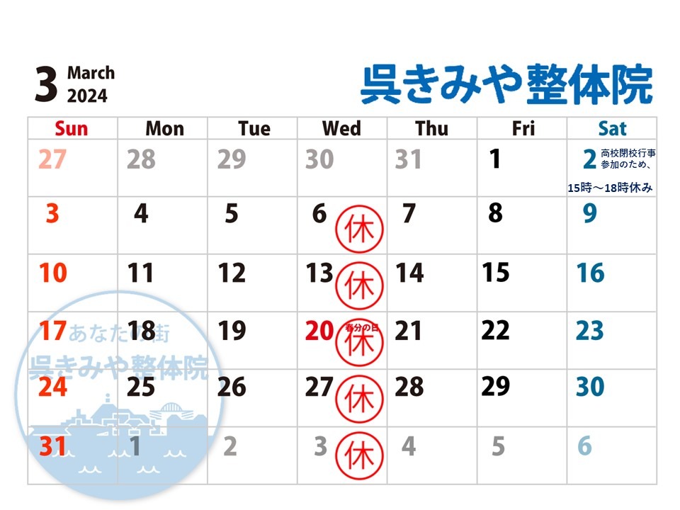 3月は講習会の予定はありませんので、定休の水曜日のみお休みをいただきます。